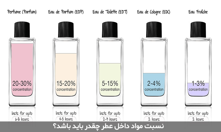 در عکس زیر به نسبت مواد در ترکیب انواع عطرها اشاره شده است: